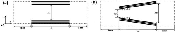 狹縫孔由半有限狹縫孔由兩個(gè)平行的石墨壁組成。每個(gè)壁包含三個(gè)石墨烯層,如圖1(a)所示?虻奶摼表示模擬框在y和z方向上的邊界。周期性邊界條件僅適用于x方向。兩個(gè)開口端與大塊氣藏相連,每個(gè)氣藏沿y軸的長度為3nm,孔隙寬度決定了z方向的尺寸。因此,通過孔內(nèi)分子與體相的相互作用,可以在孔和周圍環(huán)境之間保持機(jī)械平衡。孔徑H是指通過一個(gè)壁最內(nèi)層中碳原子中心的平面與相對壁的相應(yīng)平面之間的距離。楔形孔在圖1(b)描繪了一個(gè)開放的楔形孔及其結(jié)構(gòu)參數(shù):小端(SH)和大端(BH)的孔徑,軸向孔長(L)和半角(α)?虻奶摼表示模擬框在y和z方向上的邊界。與狹縫孔一樣,開口端周圍的氣體沿y軸的長度為3nm,大端的寬度決定了z方向的尺寸。沿軸向(即,y方向)的孔長度是有限的L,而在x方向上的尺寸在應(yīng)用周期性邊界條件的情況下假定為無限。