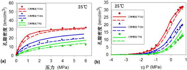 圖2:純氣體N2、CH4和CO2在T=25℃時(shí)在活性炭上的實(shí)驗(yàn)數(shù)據(jù)。用狹縫和楔形孔中的吸附等溫線預(yù)測數(shù)據(jù):(a)絕對壓力和(b)對數(shù)標(biāo)度的絕對壓力。