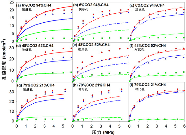 圖3:混合氣體在T=25℃在狹縫孔、楔形孔中的吸附等溫線 和理想吸附在93kPa至6.077MPa的壓力范圍內(nèi)的預(yù)測值,以及從它們的混合物中吸附的CO2和CH4。