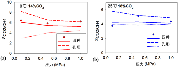 圖4:在T =(a)0℃和(b)25℃時(shí),在大約20%的二氧化碳在活性炭孔隙呢,CO2對CH4的選擇性與實(shí)驗(yàn)數(shù)據(jù)。