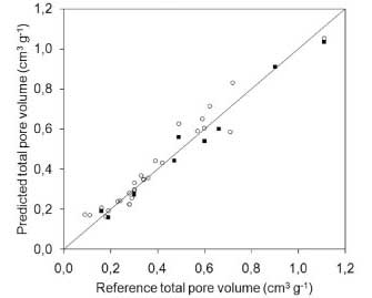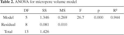 這個(gè)方程適用于微孔體積預(yù)測(cè),用包含文獻(xiàn)中的數(shù)據(jù)和由我們獲得的數(shù)據(jù)的測(cè)試樣品進(jìn)行評(píng)估。共測(cè)試了36個(gè)樣本。圖形比較(圖4)表明該模型具有良好的預(yù)測(cè)能力。該試驗(yàn)樣品組的平均絕對(duì)誤差為0.05cm 3 g -1,平均相對(duì)誤差為16.4%。表2給出了模型的統(tǒng)計(jì)參數(shù)。