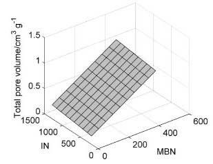 通過線性模型建立亞甲藍(lán)和碘值與總孔容的關(guān)系。使用由Kennard-Stone算法從39中選擇的10個(gè)樣本對(duì)表面進(jìn)行建模(圖5)。