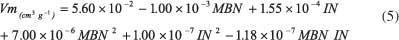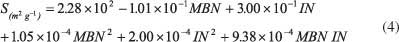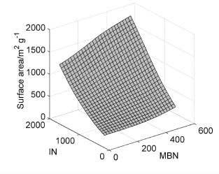 為了描述亞甲基藍(lán)和碘的數(shù)量相對(duì)于表面積的行為,使用二次模型。對(duì)于模型開發(fā),Kennard-Stone算法從105個(gè)樣本中選擇了27個(gè)樣本并用于校準(zhǔn)。樣品表面積從199到2105 m 2 g -1不等。亞甲基藍(lán)的數(shù)量在0到501毫克克每升之間,碘值從155到1670毫克克每升。建模后獲得的表面擬合(圖1)由公式4描述。