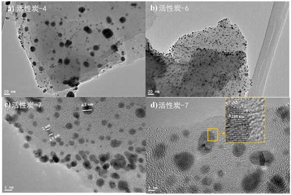 為了進(jìn)一步研究金顆粒在活性炭表面的分布和結(jié)晶度,我們拍攝了鍍金活性炭樣品的透射電子顯微鏡圖像。圖7顯示了各種活性炭樣品在不同放大倍數(shù)下的TEM圖像。圖2a、b顯示了金納米粒子在活性炭表面上的分布。很明顯,兩個樣本的分布是均勻的;钚蕴-4和活性炭-6似乎都以類似的方式相互作用和承載金納米粒子;钚蕴-7樣品的高分辨率TEM圖像如圖2c、d所示。圖2c顯示大多數(shù)金納米顆粒很小,直徑為3-5nm,并且只能看到少數(shù)團(tuán)聚顆粒。圖2d顯示了金的晶格條紋間距。發(fā)現(xiàn)晶格條紋間距為0.217nm,對應(yīng)于金晶面的面。此外,我們試圖通過TEM圖像估計顆粒尺寸的分布,我們發(fā)現(xiàn)所有樣品中超過80%的金顆粒的尺寸小于5nm。