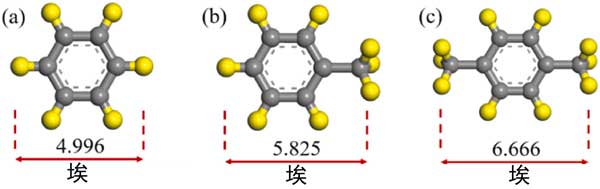 圖2:不同芳烴分子的模型(a)苯;(b)甲苯;(c)對(duì)二甲苯。