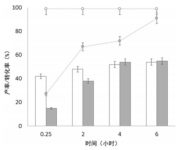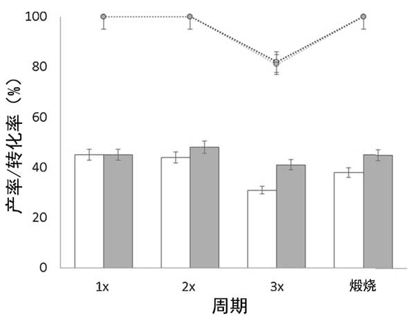 圖1:活性炭載氧化錫(白色條和點)和氧化鋅(灰色條和點)催化劑下果糖到乳酸乙酯的產(chǎn)率(條)和轉(zhuǎn)化率(點)。