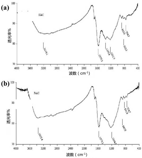 圖2:(a)活性炭和(b)改性活性炭的FTIR光譜。