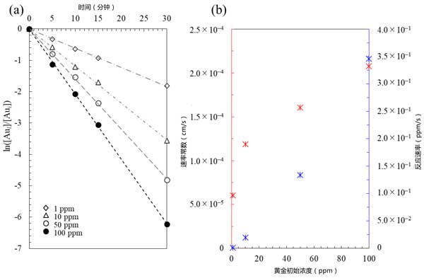 圖1:(a)初始金濃度對金離子回收率的影響,和(b)通過鋁和活性炭在銨中的電流相互作用進行的膠合反應的速率常數(shù)/反應速率與初始金濃度的關系圖硫代硫酸鹽體系(注意反應速率為負值)。