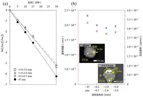 圖2:(a)活性炭尺寸對金離子回收率的影響,以及(b)鋁和活性炭在硫代硫酸銨體系中通過電偶相互作用進行的膠合反應的速率常數(shù)/速率與活性炭尺寸的關系圖(注意,反應速率為負值)。