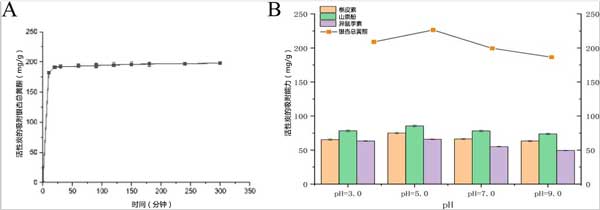 圖1:銀杏葉中銀杏總黃酮的靜態(tài)吸附曲線(A)和pH對(duì)活性炭靜態(tài)吸附的影響(B)。