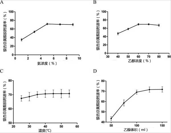 圖2:氨濃度(A)、乙醇濃度(B)、溫度(C)和乙醇體積(D)對(duì)洗脫速率的影響。