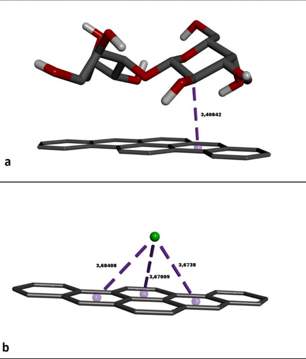 在這項研究中,進行了分子對接以檢查活性炭與乳糖以及離子:鈣的原子間相互作用。如圖2a所示,乳糖分子在其結(jié)構(gòu)中的吡喃半乳糖環(huán)的第三個碳原子上與活性碳的六角碳環(huán)形成一個疏水π-σ接觸。雖然這種非鍵合接觸的長度為3.40Å,但乳糖與活性炭的結(jié)合自由能是有利的。鈣(Ca+2)離子與三個相鄰的活性炭六角碳環(huán)形成三個鍵相互作用(圖2b)。