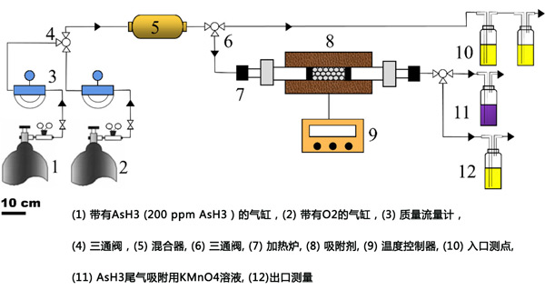 實(shí)驗(yàn)裝置的方案在圖1提供。將氣流以200mL/分鐘的氣體流速引入混合器中。該氣體由稀釋在O2(0-1.2%)中的AsH3(200ppm)組成。然后預(yù)混合氣體進(jìn)入填充有0.2g活性炭吸附柱的固定床。設(shè)置兩個采樣口:一個用于進(jìn)口氣體,一個用于出口處理后的殘余尾氣。廢氣經(jīng)酸性KMnO4處理。在這項研究中,AsH3去除效率和吸附容量用于評估活性炭的砷吸附能力。所有實(shí)驗(yàn)重復(fù)3次,計算標(biāo)準(zhǔn)差和平均值。