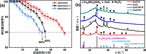 銅改性活性炭通過水洗和吹掃氣體法進(jìn)行再生。為此,活性炭樣品首先在100℃的熱空氣中活化3小時。然后用去離子水浸泡清洗4-5次,放入電熱風(fēng)烘箱中110-120℃烘干。之后,將樣品置于氮?dú)鈿夥障碌墓苁綘t中,并使用程序升溫控制器升高溫度?紤]到通過在180℃下烘烤獲得的材料,溫度首先設(shè)定在20-180℃。之后,停止加熱,將樣品冷卻至室溫。取出樣品,停止氮?dú)饬,對再生材料進(jìn)行測試。如圖3a所示,R的再生效率(R為再生吸附劑與新鮮吸附劑的穿透時間之比)在一個再生循環(huán)后為65%。在第二次再生循環(huán)后,樣品恢復(fù)效率R達(dá)到60%,證實(shí)了活性炭吸附劑對去除AsH3具有合理的再生能力。為了確定活性炭吸附劑再生后表面相的變化,通過XRD分析活性炭吸附劑。如圖3b所示,再生后活性炭-R1中35.6°、38.8°和61.8°的CuO衍射峰強(qiáng)度明顯增加,但沒有Cu2(NO3)峰被找到。這表明在再生過程中回收的一些CuO物種可能被中間體Cu2(NO3)(OH)3轉(zhuǎn)化。此外,活性炭-R1樣品中As2O3在28.0°、32.2°、35.5°、42.6°、46.4°、55.0°和59.6°處的結(jié)晶峰明顯減弱。推測中間體Cu2(NO3)(OH)3向吸附活性中心CuO的轉(zhuǎn)變和結(jié)晶As2O3的分離可能是活性炭吸附劑再生性能好的原因。