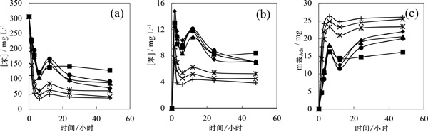 圖2:苯濃度隨水溶液(a)氣相苯濃度 (揮發(fā)) (b) 和吸附在活性炭中的苯質(zhì)量 (c) 在不同活性炭的水溶液中的吸附測試期間衰減。