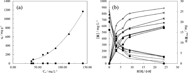 圖3:苯在水和甲醇中的吸附等溫線(a)和苯(b)在0.030L甲醇中不同量的活性炭中的吸附等溫線。左軸甲醇上的苯濃度和右軸活性炭中剩余的苯質(zhì)量。