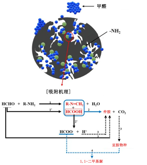 圖2:胺類在活性炭上對甲醛的作用機(jī)制。