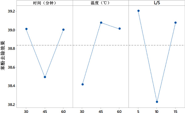 田口法用于優(yōu)化參數(shù),即時(shí)間、溫度和L/S,這些參數(shù)直接取決于苯酚的去除。選擇田口方法的選項(xiàng)越大越好。本研究的主要目的是活性炭從廢水中去除較多的苯酚,因此選擇了越大越好的選項(xiàng)。此外,采用添加劑模型來確定各個(gè)輸入?yún)?shù)對去除苯酚濃度的影響。這種分析稱為因子效應(yīng)的確定,結(jié)果見圖2。