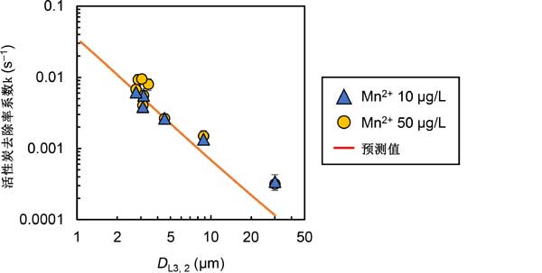 二價(jià)錳離子(Mn2+)在配水系統(tǒng)中被氧化成黑色氧化錳,是飲用水中出現(xiàn)美觀問(wèn)題的主要原因。為了去除可溶性二價(jià)錳我們研究了游離氯催化氧化去除活性炭表面上的二價(jià)錳,并發(fā)現(xiàn)當(dāng)使用微米級(jí)活性炭時(shí)效果比較好。在此,我們新推導(dǎo)出了催化反應(yīng)去除痕量物質(zhì)的動(dòng)力學(xué)模型,并將其應(yīng)用于二價(jià)錳去除。