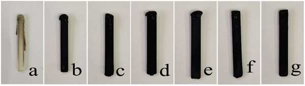 圖2:極限氧指數(shù)測(cè)試后復(fù)合材料的數(shù)字圖像:(a)聚乳酸,(b)添加活性炭3%,(c)添加活性炭6%,(d)添加活性炭9%,(e)添加改性活性炭3%,(f)添加改性活性炭6%,(g)添加改性活性炭9%。