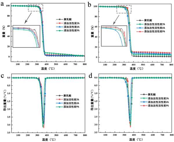 熱重分析結(jié)果列于圖3中。所有樣品均呈現(xiàn)單一熱降解階段,但5%質(zhì)量損失溫度(T5%)或熱降解速率最高溫度(Tmax)略有不同。純聚乳酸在322℃時(shí)開始快速降解,如圖3a所示,其Tmax達(dá)到363℃,并且在400℃時(shí)幾乎所有質(zhì)量都損失了。在800℃的終端溫度下測(cè)得相應(yīng)的殘?zhí)柯蕛H為1.35%。相比之下,當(dāng)應(yīng)用改性活性炭時(shí),酸性添加劑(磷酸鹽)會(huì)促進(jìn)聚乳酸復(fù)合材料的較早分解,這與之前的結(jié)果一致。殘?zhí)柯孰S著復(fù)合材料中改性活性炭的加載而逐漸增加。純聚乳酸和改性活性炭復(fù)合材料的Tmax幾乎沒有差異,分別為363℃、364℃、357℃和363℃。因此可以看出,改性活性炭負(fù)載對(duì)聚乳酸降解沒有影響。在600℃到800℃的范圍內(nèi),聚乳酸燃燒的殘余物沒有質(zhì)量變化,但在一定程度上可以觀察到輕微的質(zhì)量損失,表明加入改性活性炭后復(fù)合材料的燃燒延遲。