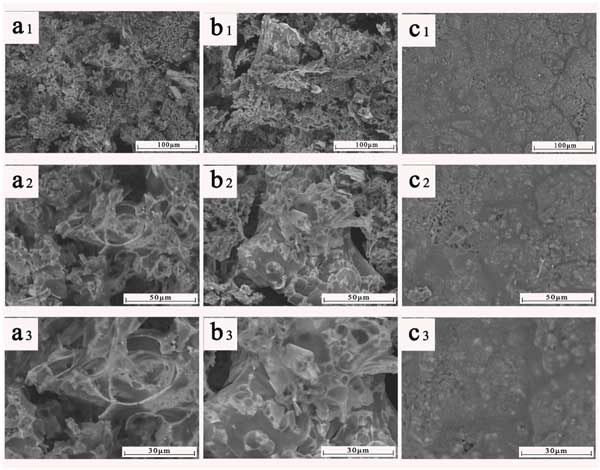 圖4:錐形量熱儀測(cè)試復(fù)合材料中殘留碳的形態(tài):改性活性炭3%(a)、改性活性炭6%(b)和改性活性炭9%(c)。