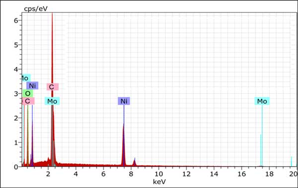 圖1:6%NiMo活性炭催化劑的EDX光譜,分析證實(shí)存在約82%的活性炭、5.7%的鎳和14.5%的鉬。