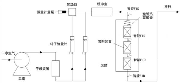 動態(tài)吸附技術(shù)用于測量甲苯吸附平衡等溫線。圖1描述了實驗裝置。通過該裝置獲得吸附飽和的活性炭。在不同的溫度和濃度下,測量了甲苯的飽和吸附容量。入口溫度和甲苯濃度設定為25–180℃和5–50g/m3;钚蕴课降募妆綒怏w濃度為15g/m3。使用重量分析技術(shù)測量吸附等溫線。實驗裝置以實驗室環(huán)境空氣為氣源,通過鼓風機將空氣送入裝置。在硅膠干燥裝置中除去水蒸氣后,通過數(shù)顯質(zhì)量流量計的控制,按計算出的比例分成兩路。單向氣流以設定濃度進入氣體發(fā)生裝置,即甲苯揮發(fā)后的載氣,在氣體緩沖室中與反向流動的稀釋氣體充分混合后進入吸附系統(tǒng)。在吸附系統(tǒng)中,吸附柱緊密均勻地填充CTC100活性炭顆粒,并用鐵架垂直放置在設定實驗溫度的恒溫干燥箱中;旌霞妆綒怏w首先在恒溫干燥箱內(nèi)通過氣體預熱管道達到實驗溫度,然后進入裝有活性炭的吸附柱進行吸附實驗。吸附氣體通過檢測口進入檢測系統(tǒng),智能FID通過連續(xù)采樣測量甲苯出口濃度。當氣體發(fā)生裝置產(chǎn)生的入口濃度與智能FID檢測的出口濃度一致時,吸附柱中的活性炭達到吸附平衡。吸附氣體通過檢測口進入檢測系統(tǒng),智能FID通過連續(xù)采樣測量甲苯出口濃度。當氣體發(fā)生裝置產(chǎn)生的入口濃度與智能FID檢測的出口濃度一致時,吸附柱中的活性炭達到吸附平衡。吸附氣體通過檢測口進入檢測系統(tǒng),智能FID通過連續(xù)采樣測量甲苯出口濃度。當氣體發(fā)生裝置產(chǎn)生的入口濃度與智能FID檢測的出口濃度一致時,吸附柱中的活性炭達到吸附平衡。