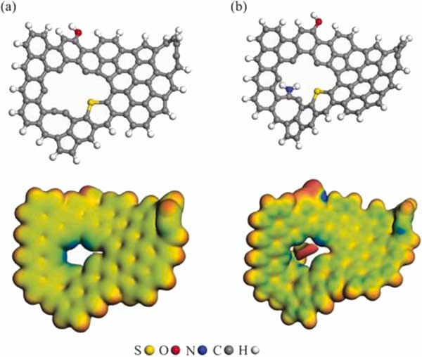 進行色散校正的DFT計算以進一步了解汽油分子在活性炭和胺浸漬活性炭吸附劑上的吸附。為了實現(xiàn)這一目標,我們對兩個碳片結(jié)構(gòu)進行了建模,在多孔部位周圍放置了一個硫原子;谥暗腄FT計算,我們模擬了一個能量和有利的配置。由于沿活性炭和胺浸漬活性炭的邊緣存在羥基(OH),因此還引入了OH部分。此外,六亞甲基四部分由NH2官能團模擬,該官能團最有可能連接到調(diào)制結(jié)構(gòu)的乙酰碳原子上。圖4a和b分別描繪了模擬的活性炭和浸漬活性炭吸附劑的優(yōu)化幾何結(jié)構(gòu)。我們的DFT計算表明,在幾何松弛之后,兩個系統(tǒng)都發(fā)生了相當大的扭曲,這主要是由于缺陷的存在。因此,原子電荷在建模系統(tǒng)上的分布不太可能是均勻的。從Hirshfeld電荷密度分析中可以明顯看出這一點,該分析表明缺陷位點周圍的碳原子以及吸附劑結(jié)構(gòu)邊緣的碳原子帶負電。從圖4的分子靜電勢分析也可以看出這一點,它表明活性炭中心空位周圍的碳原子具有負電勢(藍色區(qū)域),表明它們具有與親核反應(yīng)的能力物種。請注意,添加NH2組會嚴重影響活性炭的MEP,特別是在空置區(qū)域。這意味著六亞甲基四胺改性活性炭吸附劑的表面反應(yīng)性可能大于活性炭的表面反應(yīng)性。