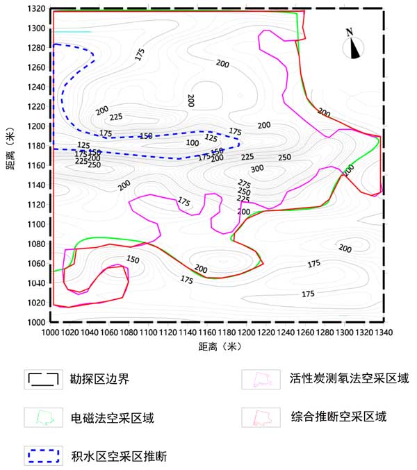 本次調(diào)查工作將電磁法與活性炭測氡法相結(jié)合,形成綜合物探方法,對某礦區(qū)地下采空區(qū)情況進(jìn)行了研究。首先,電磁法用于探測采空區(qū)的深度探測。發(fā)現(xiàn)1個(gè)低阻異常帶和1個(gè)高阻異常帶,推測后者為采空區(qū)異常帶,前者由采空區(qū)積水或大鵬地層水富集形成,推測為采空區(qū)積水異常帶。然后使用用于測氡的活性炭方法來推斷地下采空區(qū)的位置和范圍。結(jié)合電磁法勘探成果,推測該采空區(qū)為氡值異常帶。