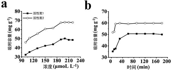 圖1:兩種活性炭對銅離子的(a)等溫吸附和(b)動態(tài)吸附。