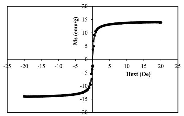 復合磁性材料的磁性測量顯示出室溫下的超順磁性。圖2顯示了在24.8℃溫度下測量的活性炭磁鐵礦材料的磁滯回線的存在。磁性活性炭的飽和磁化強度(Ms)值為14.06emu/g。磁性復合材料合成通常會降低純磁性材料的飽和磁化強度(Ms)值。
