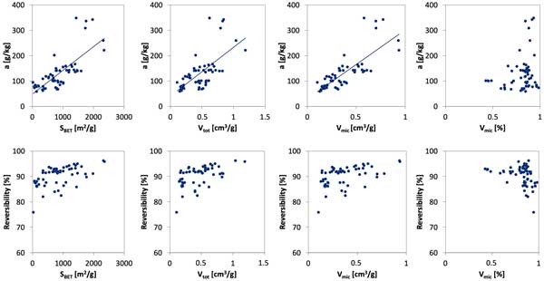 圖1:氨吸附能力和可逆性與原材料、炭和制備的活性炭的多孔結(jié)構(gòu)參數(shù)的相關(guān)性。