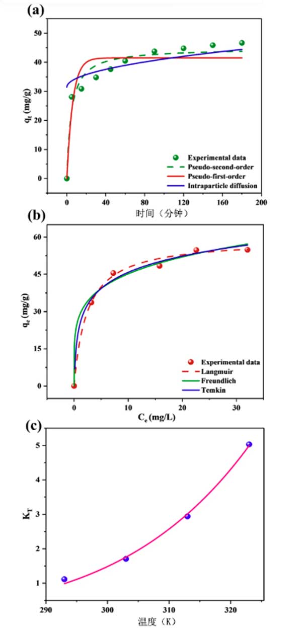 圖3:(a)吸附動(dòng)力學(xué),(b)吸附等溫線和(c)van't hoff圖,用于吸附Cr上的活性炭上。