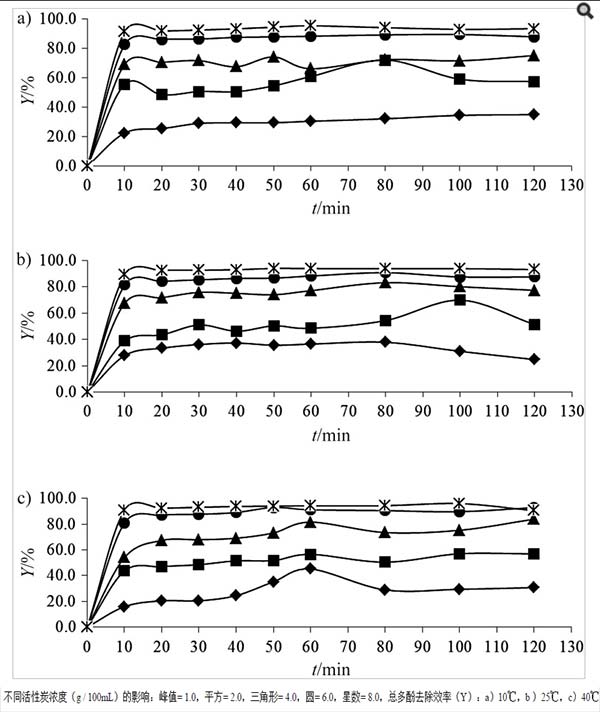所用活性炭的濃度是控制吸附的重要因素。眾所周知,溫度是影響任何吸附過程的附加因素。因此,在三個不同的溫度,室溫(25℃),高于(40℃)和波紋管(10℃)下進行測試。為了觀察溫度和吸附劑量對多酚吸附的同時影響,吸附劑濃度從1至8g / 100mL變化。使用相同數(shù)量的廢水(25mL)和恒定的酚濃度(3.0mg / mL)進行不同的測試,但改變活性炭的量(0.25、0.5、1.0、1.5和2.0g)。在圖中可以觀察到不同溫度下的吸附趨勢。
