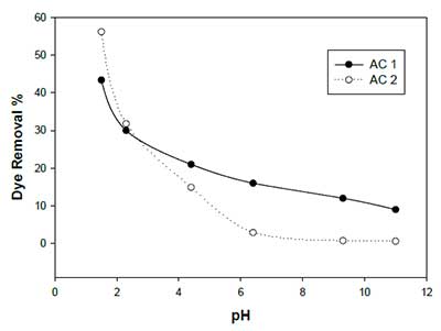 考察了溶液酸度對(duì)活性炭對(duì)檸檬黃吸附的影響,初始pH范圍為1.5〜11.0,見(jiàn)圖1。吸附研究在37℃進(jìn)行。染料的典型pH值與百分比的去除在較高的pH值下顯示出染料百分比的顯著降低。觀察到pH值高于6.0的染料吸收的減少,此后觀察到吸附量沒(méi)有變化。對(duì)于AC1和AC2,在pH1.5分別達(dá)到染料的最大攝取(43.4和56.2%)。因此,選擇pH 1.5作為進(jìn)行后續(xù)研究的最佳值。該pH值也是人類(lèi)胃的近似pH值。得到的結(jié)果表示因質(zhì)子化而增加中和吸附劑表面上的負(fù)電荷,這有利于擴(kuò)散并提供吸附劑的更多活性表面,由此在其表面處產(chǎn)生更大的吸附。溶液的pH控制吸附劑和被吸附物之間的靜電相互作用。隨著pH的增加,去除百分比的降低可能是由于去質(zhì)子化,這阻礙了吸附劑和山梨酸之間的靜電力,導(dǎo)致吸附能力降低。pH對(duì)AC吸附容量的影響與以前水溶液中吸收酒石黃的結(jié)果是一致的。