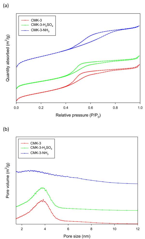 表1列出了本研究中使用的活性炭的物理性質(zhì);钚蕴-3的比表面積為1178m 2 / g。經(jīng)硫酸處理后比表面積略有下降至1,002m 2 / g,經(jīng)氨處理后比表面積大幅度上升至1663m 2 / g。圖2示出了氮?dú)馕降葴鼐(xiàn)和孔碳的孔隙大小分布。圖2a示出了用于活性炭-3,活性炭-3-H的氮吸附等溫線(xiàn)2 SO 4,和活性炭-3-NH 3。所有樣品在0.5 的相對(duì)壓力(P / P 0)下都顯示典型的介孔材料的IV型等溫線(xiàn)。表表11表明,CMK-3具有的3.8納米的孔徑中孔。用硫酸處理后維持這些中孔。當(dāng)活性炭-3用氨處理時(shí),平均孔徑減小到3.1nm。氨處理是高溫(900℃)工藝,其產(chǎn)生微孔,引起表面積的大量增加和平均孔徑的減小。另一方面,大部分介孔活性炭-3在氨處理后保持。