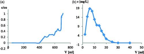 圖2.(a)氧化活性炭上銨離子(NH4+)的SPE(c/c0=f(V))過(guò)程中的穿透曲線。(mcar=0.104g ,離子濃度c=NH4+- = 0.661mg/L)。指定每5ml濾液的比例c/c0。(b)經(jīng)過(guò)SPE柱分析每2ml洗脫液后,來(lái)自經(jīng)氧化的活性炭的銨離子解吸曲線(c= f(V))。