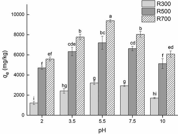圖3. pH對(duì)活性炭吸附四氯化碳的吸附能力的影響。四環(huán)素溶液濃度為32mg / L。數(shù)值是三重均值±SD。字母表示處理之間在p <0.05水平上的顯著差異。