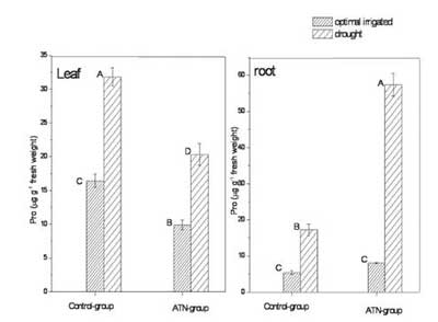 我們在所有檢查組中干旱脅迫條件下脯氨酸含量增加(圖1)。在干旱條件下,與對照組相比,活性炭混合物的存在與葉中脯氨酸含量稍低有關(guān),這表明活性炭混合物在干旱條件下有積極作用。