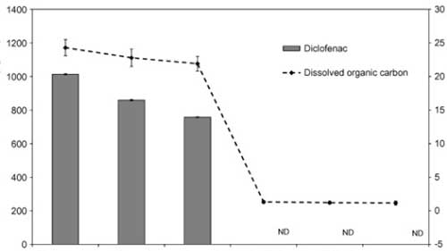使用活性炭除去雙氯芬酸鈉是定性高效的,通過零吸收和低濃度的DOC的,并且在通過所獲得的色譜中沒有檢測到雙氯芬酸鈉。得在所研究的處理階段中,在活性炭上的吸附導(dǎo)致最顯著的雙氯芬酸鈉去除。因此,雙氯芬酸鈉沒有水樣中的這個階段(LOD之后檢測 = 2 μg L−1)?紤]到所述方法的定量限為3 μg L−1,通過活性炭除去雙氯芬酸鈉的至少99.7%。因為沒有研究活性炭的破裂曲線,所以活性炭的結(jié)果可以被認為是定性的。然而,為了研究在大型水處理廠中去除雙氯芬酸鈉,必須改進該方法以達到較低的檢測限(約μg L−1)。