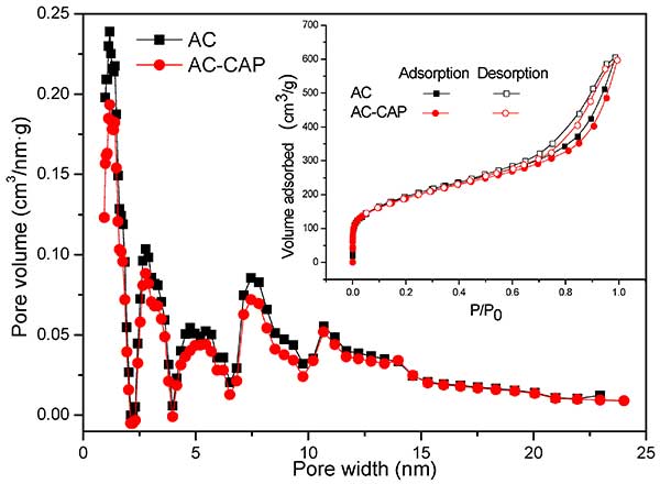 圖1.在氯霉素吸附之前活性炭的分子量 和N 2吸附/解吸等溫線(插入)和氯霉素吸附之后的活性炭?讖椒植加擅芏确汉碚(DFT)方法確定。