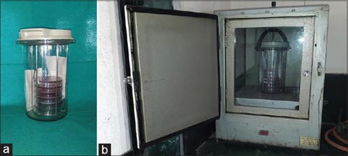圖3:(a)然后將瓊脂平板置于氣體包裝罐中進行厭氧培養(yǎng)。(b)然后將氣體包裝罐置于培養(yǎng)箱中48小時。