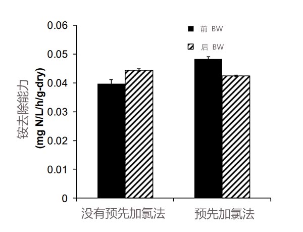 圖2顯示了反洗前后活性炭的銨去除能力的變化。沒有預(yù)氯化,銨去除能力為0.040mgN/L/h/g-dry。在第一次取樣后反洗(p<0.01)后,它增加了12%。另一方面,當(dāng)實(shí)施預(yù)氯化時(shí),去洗后的去除能力降低了12%(從0.048到0.042mg N/L/h/g-dry)(p<0.01)。
