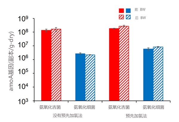 圖3:在“無預(yù)氯化”和“預(yù)氯化”的采樣時(shí)間之前(實(shí)心棒)和之后(帶斜線的棒)反洗的活性炭上AOA和AOB的豐度。