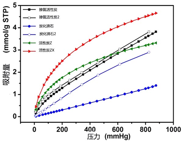 圖3顯示炭化沸石對CO 2和N 2的吸附比較低。值得注意的是, 與其他相比,摻氮活性炭在 p > 0.5 bar時(shí)顯示出較高的CO 2吸附,這主要?dú)w因于四極CO 2分子與不飽和金屬位點(diǎn)中的正電荷之間的相互作用。此外,除摻氮活性炭外,還包括CO2和N 2吸附容量遵循活性炭Z>活性炭ZX>炭化沸石的順序,這意味著這些前體生產(chǎn)的氮摻雜活性炭具有顯著的氣體吸附性能。