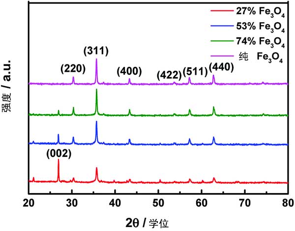 使用XRD衍射儀測量活性炭復(fù)合物的晶體結(jié)構(gòu)。圖1顯示了所制備樣品的衍射圖案。在2的特征衍射峰θ= 31.24°,36.82°,44.76°,55.62°,59.30°和65.19°的與(220),(311),(400),(422),(511)和(440)Fe 3 O 4平面一致。此外,在約2峰值θ=26.20°被分配給蓬松結(jié)構(gòu)化活性炭。觀察到Fe 3 O 4衍射峰的強(qiáng)度隨著Fe 3 O 4納米顆粒負(fù)載量的增加而增強(qiáng),并且活性炭的強(qiáng)度在相同的過程中減少。上述現(xiàn)象表明Fe 3 O 4納米顆?梢猿晒Φ匾肱钏山Y(jié)構(gòu)的活性炭上。