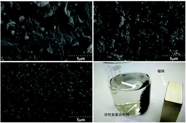 圖2:活性炭,活性炭復(fù)合材料,F(xiàn)e 3 O 4納米顆粒的SEM圖像與宏觀圖。