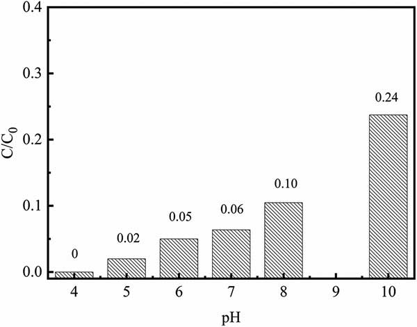 初始pH對(duì)鉻酸鹽去除能力的影響如圖3所示。發(fā)現(xiàn)鉻酸鹽的去除能力明顯受pH值在4.0-10.0范圍內(nèi)的影響。隨著溶液pH從4增加到10,鉻酸鹽去除率從100%下降到76%。在pH~4.0時(shí),HCrO 4是鉻酸鹽的主要形式。因此,在高溶液的pH值,使Cr之間的強(qiáng)烈競(jìng)爭(zhēng)羥基(OH)應(yīng)該是低鉻酸鹽去除能力的主要原因。此外,較低的pH可有助于去除無源氧化鐵層,活性炭復(fù)合材料的表面中含有納米零價(jià)鐵用于接觸周圍的Cr(vi)溶液。因此,在所有后續(xù)的程序?qū)r溶液的初始pH設(shè)定為4.0。