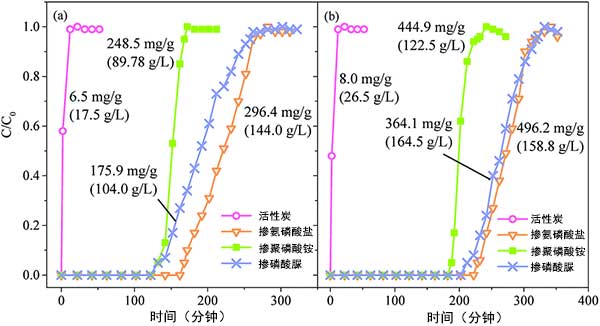活性炭對甲苯的穿透曲線以及吸附容量如圖2所示。沒摻氮的活性炭表現(xiàn)出較差的甲苯吸附性能,吸附容量分別為6.5和8.0mg g-1。與摻氮活性炭相比,添加含氮磷酸鹽的活性炭需要更長的時間才能接近突破并表現(xiàn)出更高的吸附能力。對于在600℃下制備的活性炭,其經(jīng)含氮磷酸鹽處理的活性炭的突破時間為氨磷酸鹽活性炭>磷酸脲活性炭>聚磷酸銨活性炭,其相應的體積吸附容量為144.0,104.0和89.8g L-1,質(zhì)量吸附容量分別為296.4,175.9和245.8 mg g-1,分別。與600℃相比,900℃制備的活性炭具有更高的甲苯吸收量,體積吸附容量為122.5-164.5g L -1,質(zhì)量吸附容量為364.1~496.2 mg g-1。值得注意的是,可以看出氨磷酸鹽處理的活性炭具有較高的質(zhì)量吸附能力,而磷酸脲處理的活性炭具有較高的體積吸附能力。這可能歸因于它們不同的堆積密度,氨磷酸鹽具有比磷酸脲更高的堆積密度。
